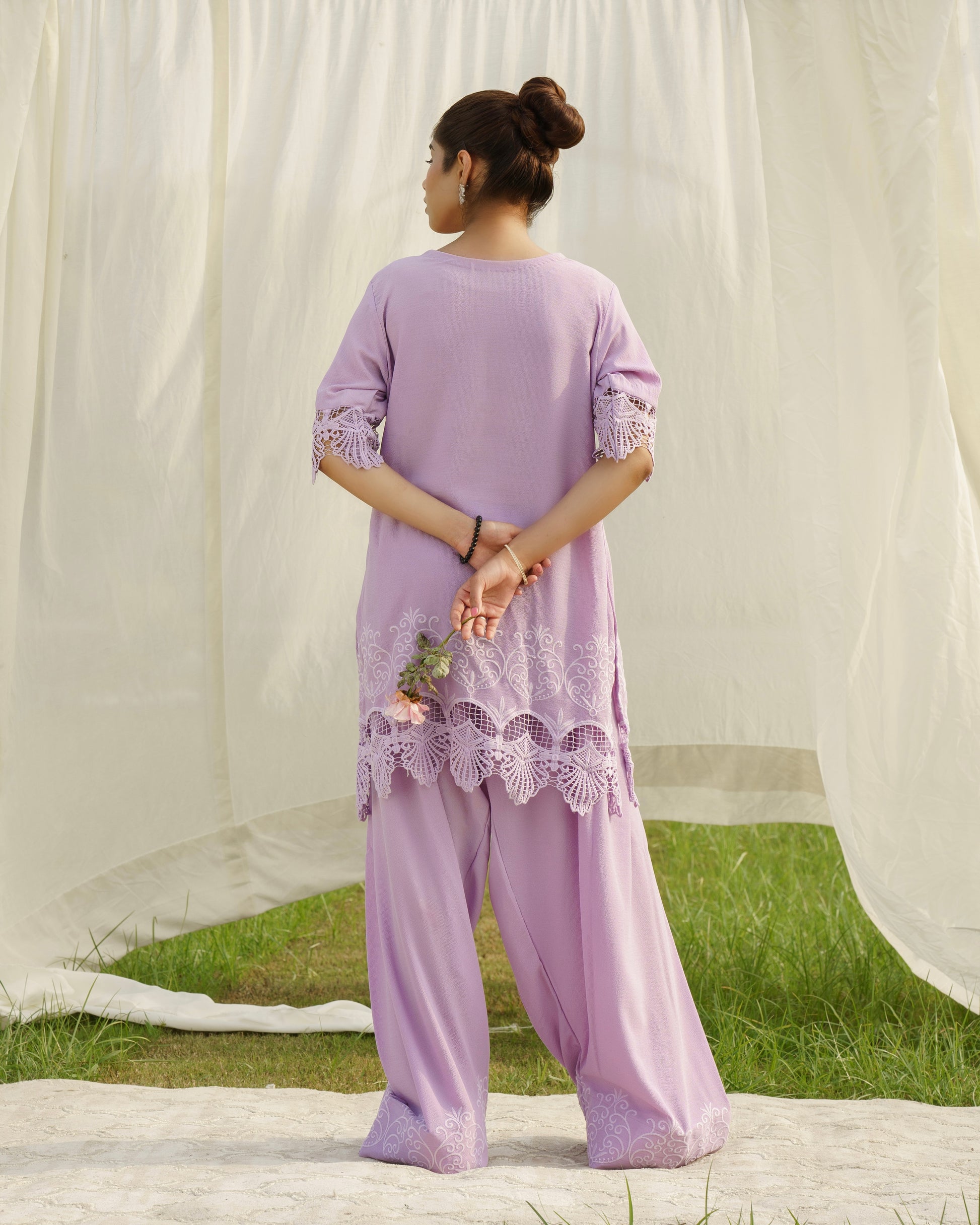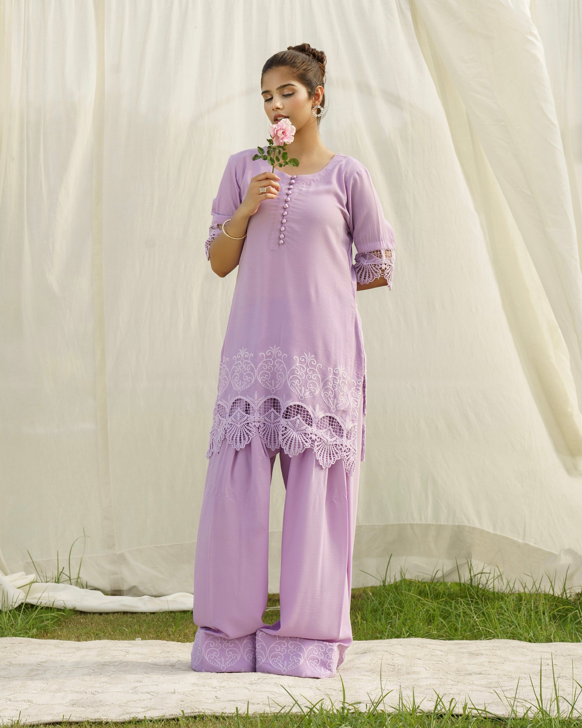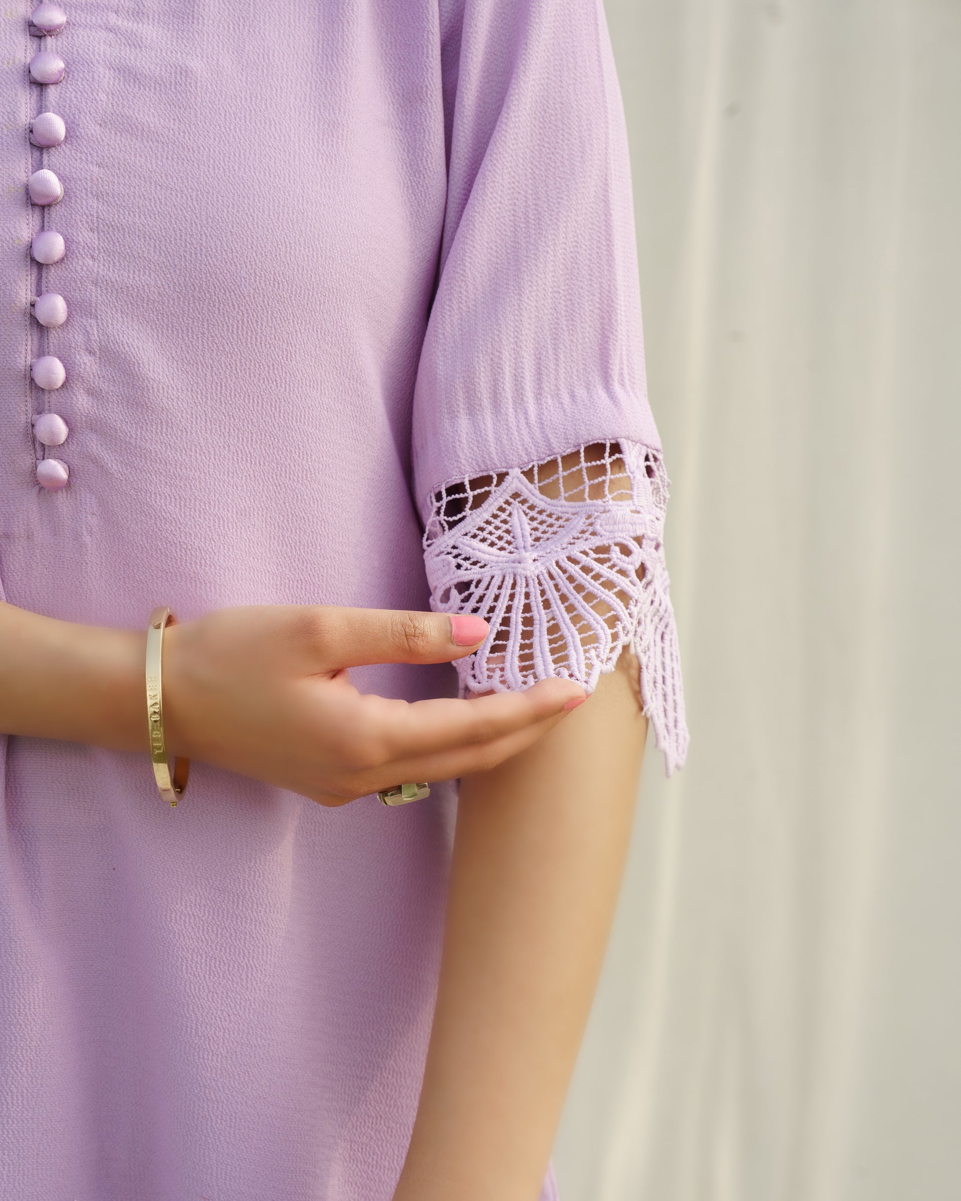 This dreamy lilac two-piece ensemble exudes effortless elegance with a soft, feminine touch. The short shirt features delicate lace detailing along the hemline and sleeves, paired with matching fabric buttons down the front for a subtle yet refined accent. Paired with farshi shalwar that boast coordinated embroidery. The lightweight fabric and airy silhouette add to its charm, making it as comfortable as it is stylish.
