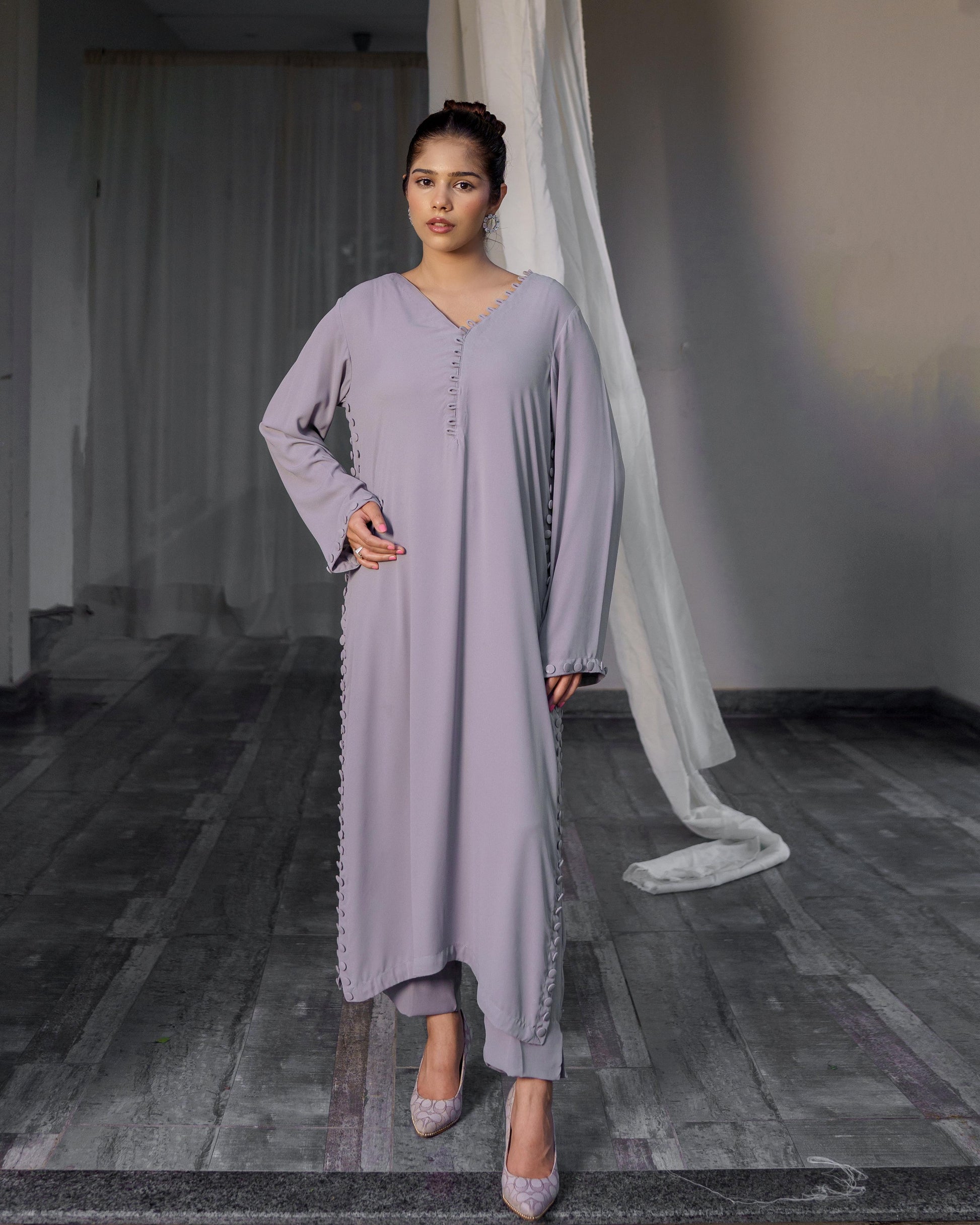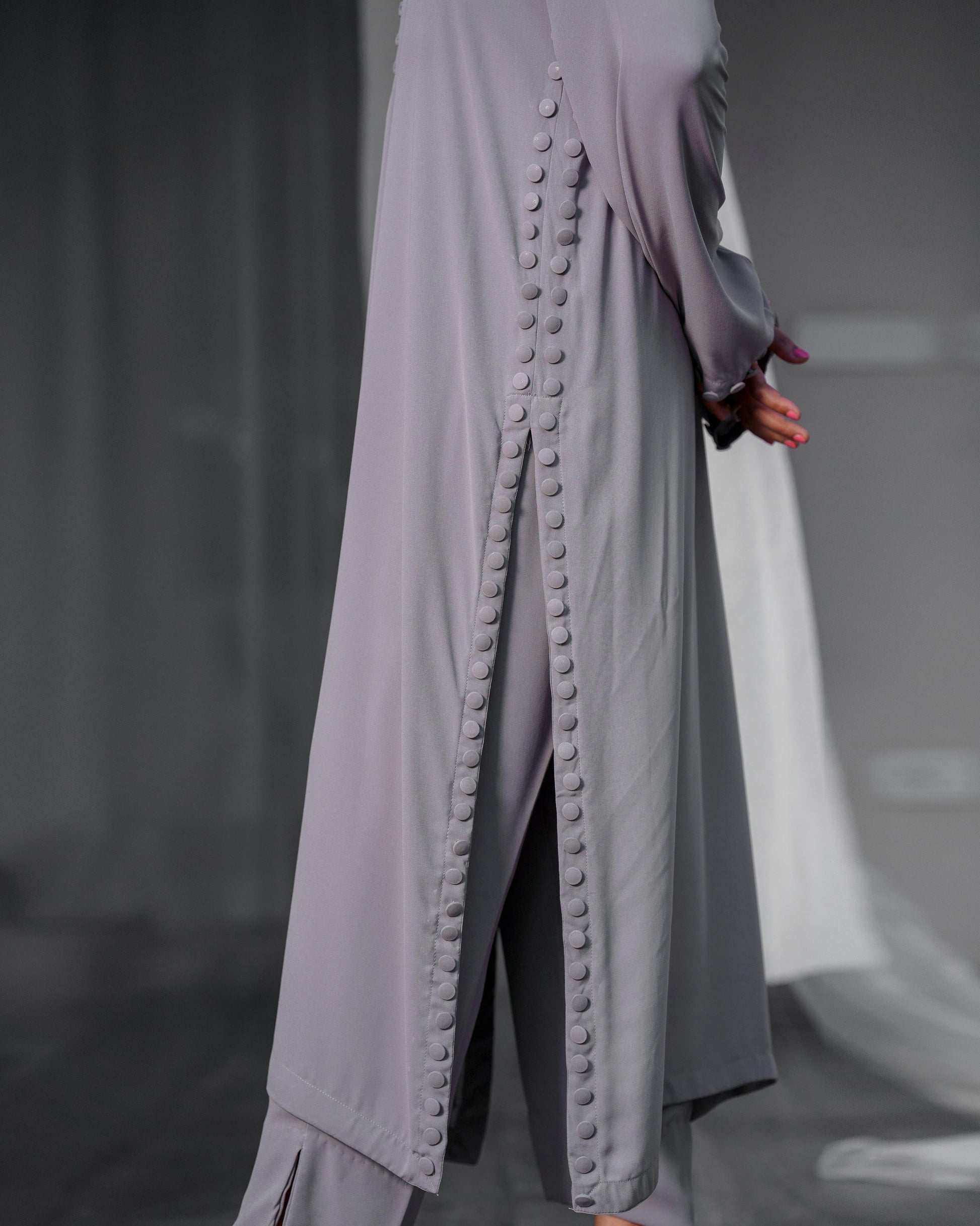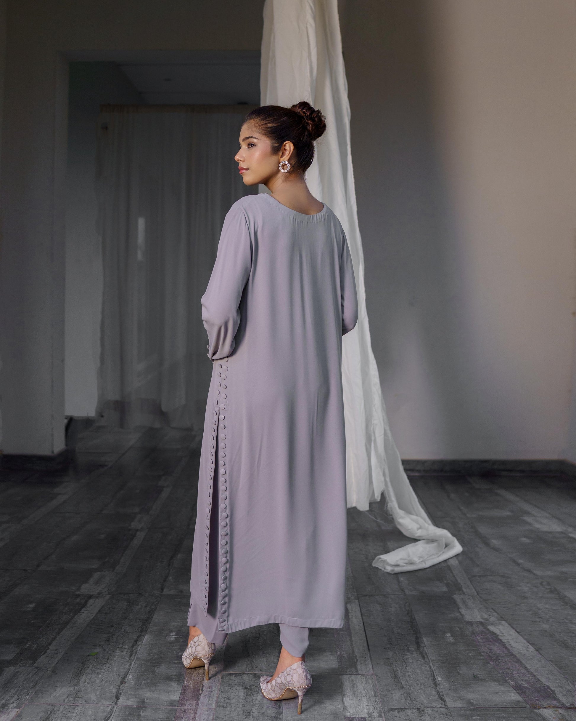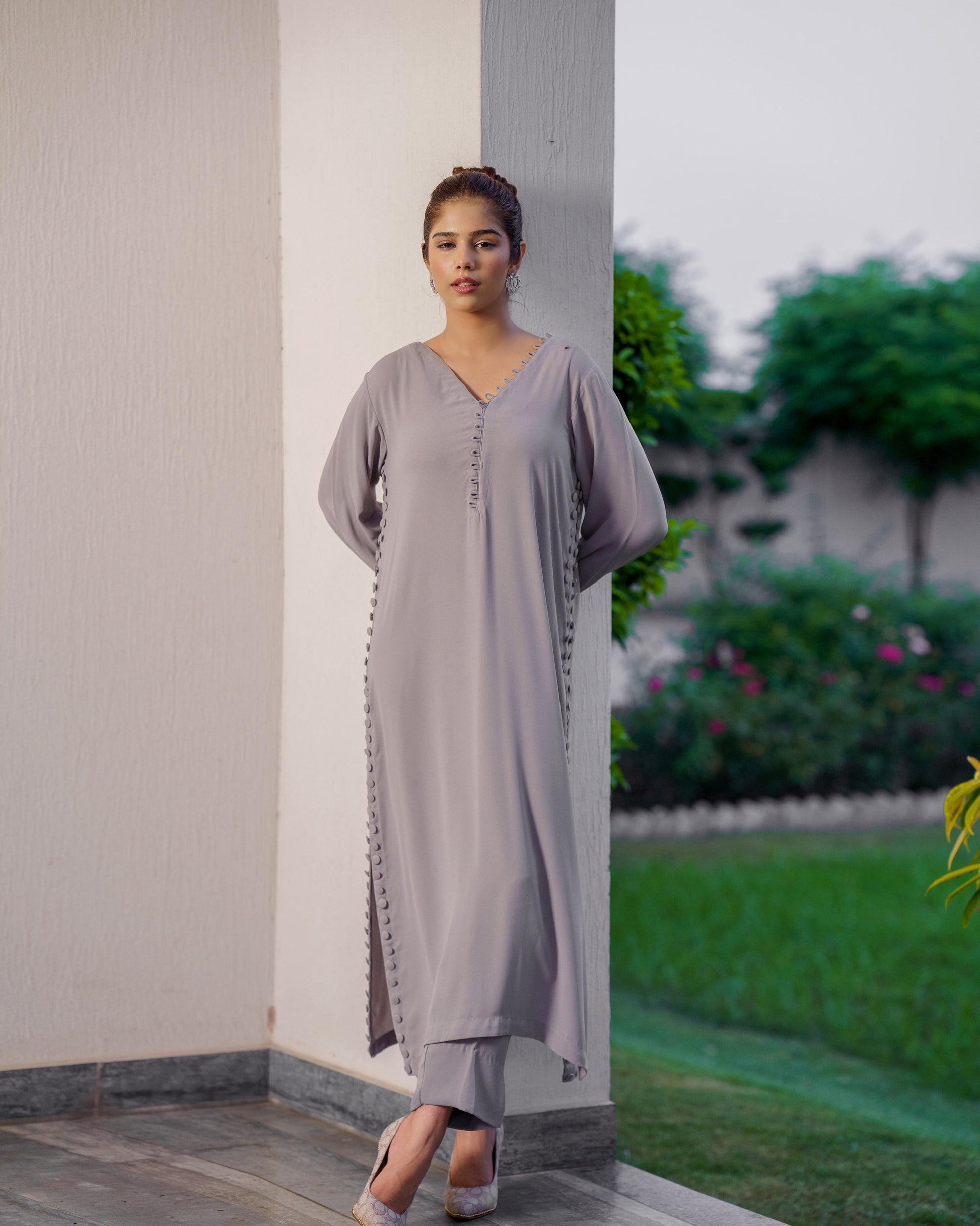 This outfit features a grey long shirt with delicate buttons embellishments along the sleeves and sides, adding a subtle but elegant detail. The shirt is paired with straight trouser in a matching tone, creating a cohesive monochrome look. The V- neckline and full sleeves offer modesty and grace, while the flowing silhouette ensures comfort and style.